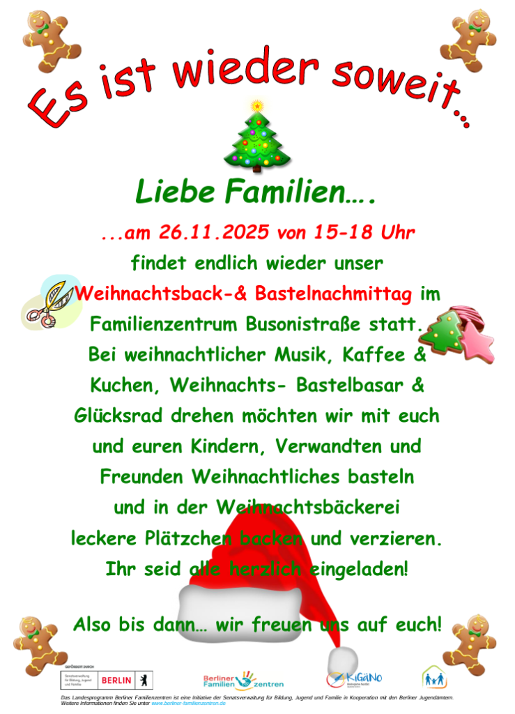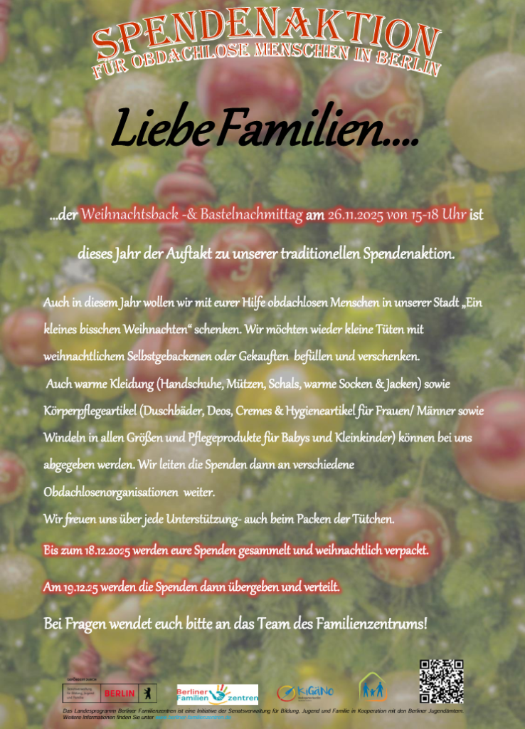 Seit vielen Jahren ist es uns ein wichtiges Anliegen und mittlerweile Tradition, dass wir für obdachlose Menschen in Berlin Spenden sammeln. Im Rahmen unseres Weihnachtsback-und Bastelnachmittags am 27.11.25 wird wieder fleißig gebacken, verziert, genascht und gespendet. Zusätzlich kann jeder der möchte weitere weihnachtliche Süßwaren wie selbstgebackene (oder gekaufte) Plätzchen, Spekulatius, Dominosteine, Schokolade etc. bei uns abgeben. Die gespendeten Süßigkeiten packen wir in kleine Geschenktüten und leiten diese an verschiedene Berliner Obdachlosenorganisationen weiter. Die Weihnachtstüten werden dann am Heiligabend von fleißigen Helfern verteilt. Auch warme Kleidung (Handschuhe, Mützen, Schals etc.) sowie Hygieneartikel für Männer, Frauen & Kinder können gespendet werden. Vor dem Büro des Familienzentrums im Erdgeschoss werden mehrere Spendenboxen aufgestellt, in die ihr eure Spenden reinpacken könnt.